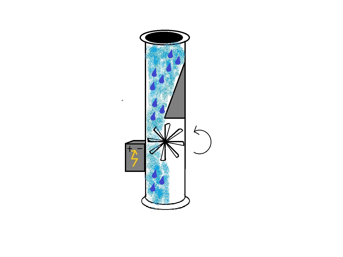 Une petite hélice est introduite en bas d’un tuyau de gouttière, et l’eau qui tombe la fait tourner en produisant de l’électricité. Plus le tuyau est haut, plus l’hélice va tourner vite.
