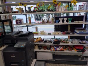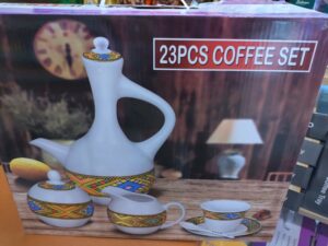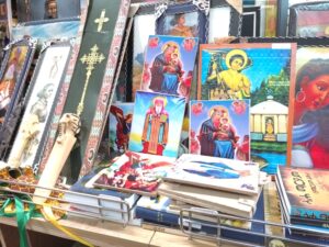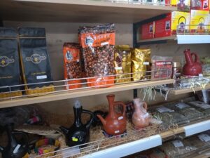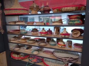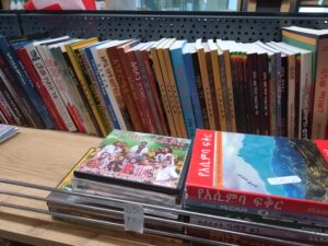 Divers objets d’Ethiopie et livres écrits en Amharique. የተለያዩ የኢትዮጵያ እቃዎች እና በአማርኛ የተፃፉ መፃህፍቶች።