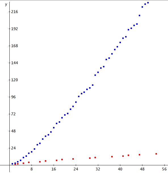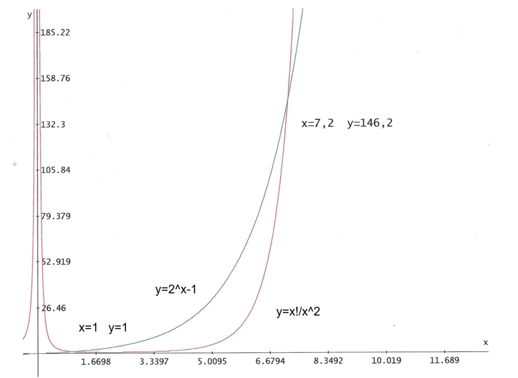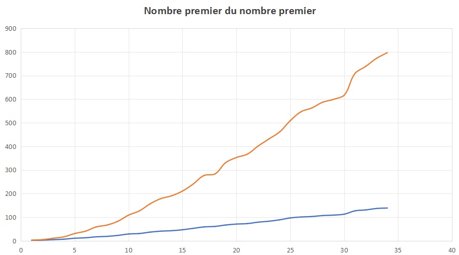 On peut dire que LA FORMULE des nombres premiers est celle de Mersenne (y=2^x-1) pour trouver les plus grands, c’est celle qui est le plus utilisée. Le graphique de gauche avec ma formule y=x!/x^2 se croise deux fois (Par un et par lui-même?). Le graphique de droite, je me suis amusé à faire les nombres premiers des nombres premiers.