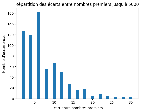 Ci-dessous, le graphique des nombres premiers, évidemment toujours sans formule simple. Voilà ce qu’on voit quand on inverse les axes. Puis les différences entre chaque nombres premiers jusqu’à 5000, il y a 162 fois un écart de 6.